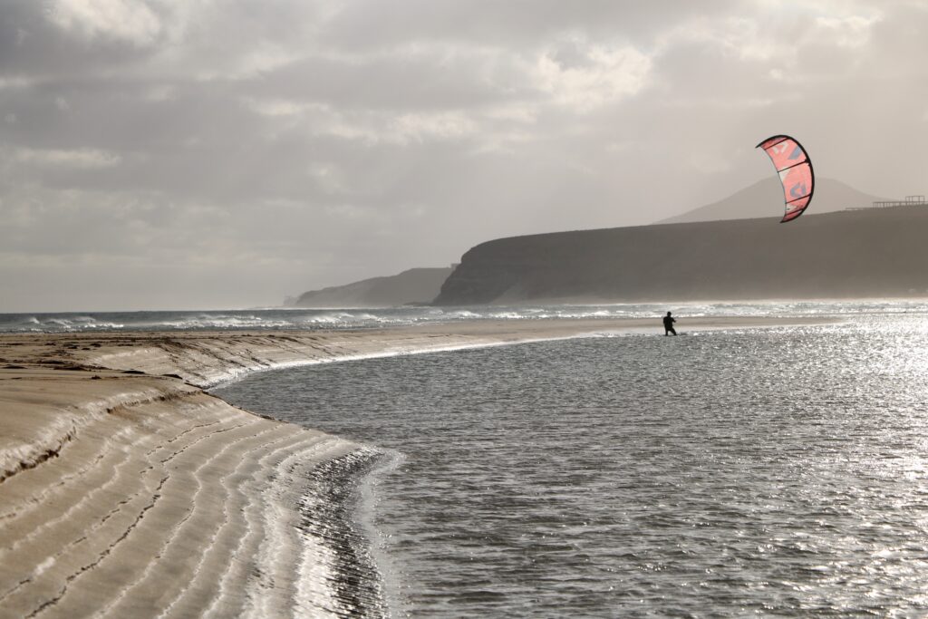 Po wrażeniach z ZOO wybraliśmy się dalej w kierunku drugiego obszaru wydmowego na wyspie, czyli Wydm Jandia. Naszym punktem docelowym była plaża Playa de la Barca w trakcie odpływu. Spacer lagunami od „wyspy” do „wyspy” na plaży sprawił nam bardzo dużo frajdy. Dodatkową atrakcją było obserwowanie kitesurferów, którzy szaleli na wodzie. Region plaż półwyspu Jandii mamy na liście do zgłębienia przy potencjalnej kolejnej wyprawie na Fuerteventurę – zdecydowanie jest tam więcej do odkrycia.