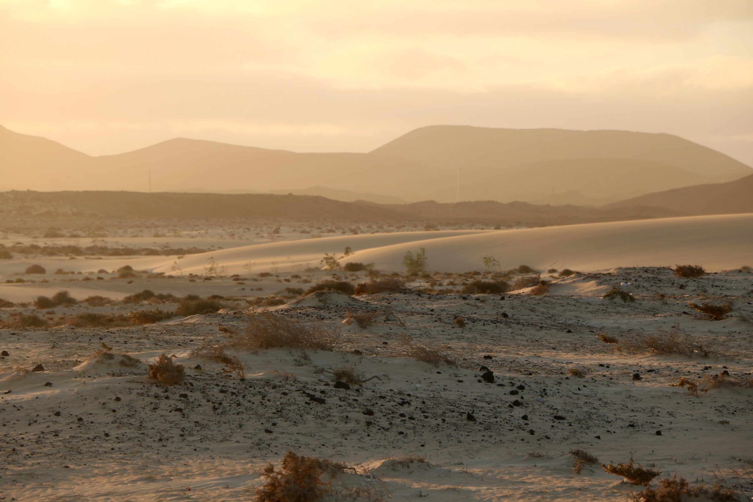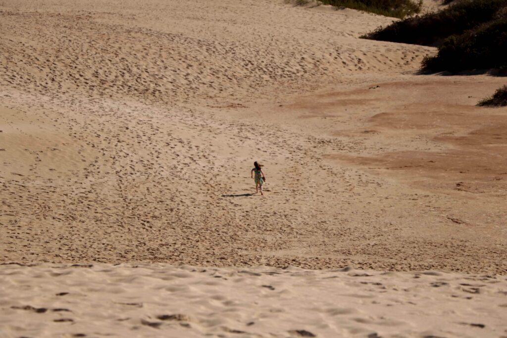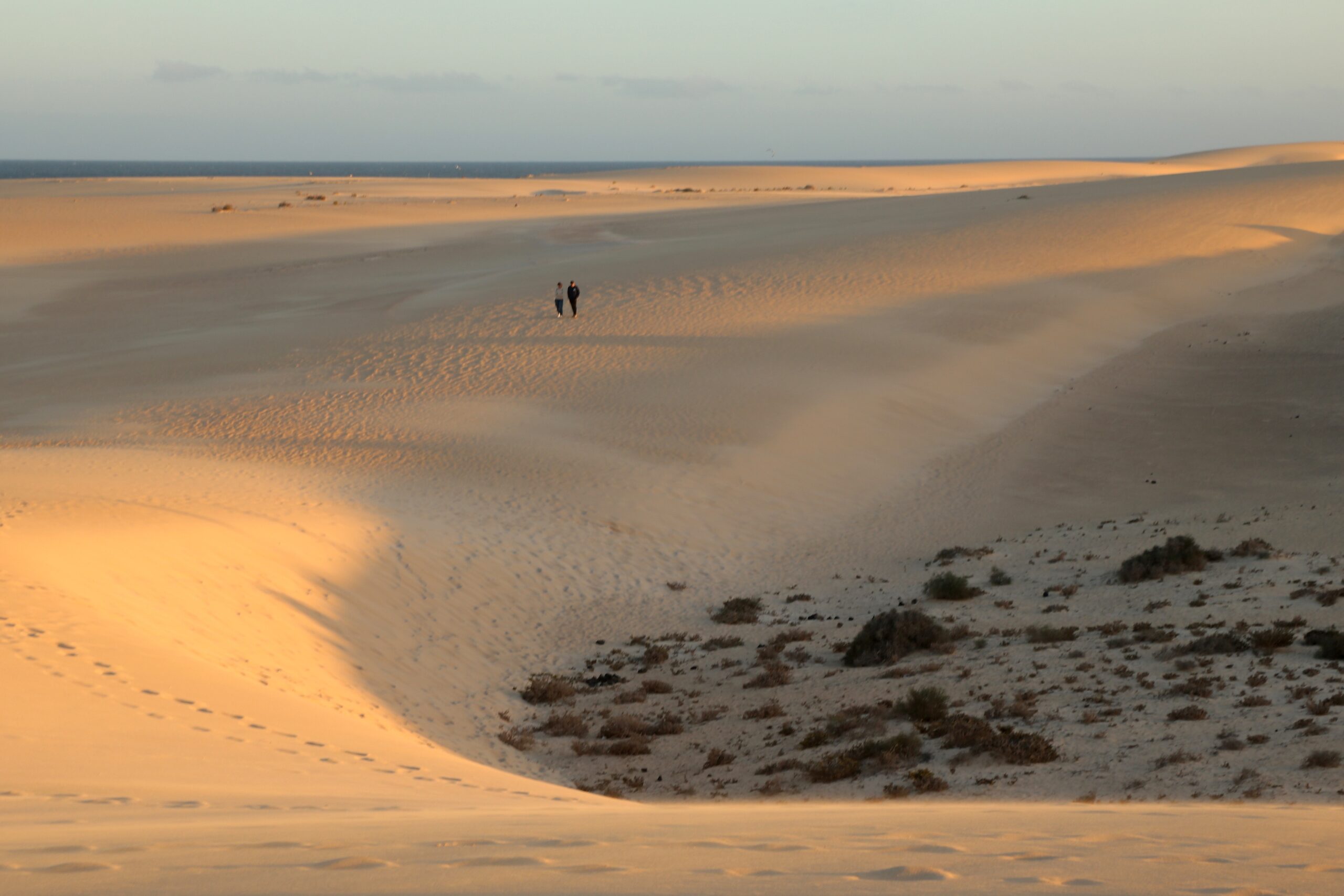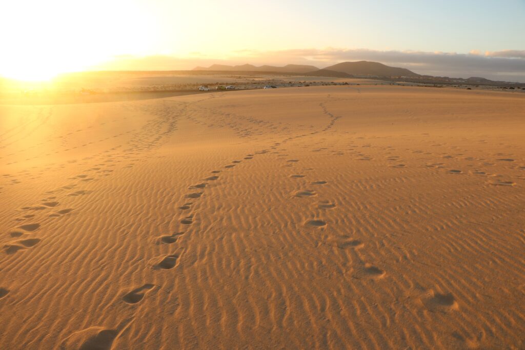 Pierwszego dnia pobytu na Fuerteventurze postanowiliśmy skorzystać z bezwietrznej pogody i wybrać się do Parku Przyrody Corralejo, wyjątkowego terenu wydmowego, który ciągnie się ponad 10 km pasem wzdłuż północno-zachodniego brzegu wyspy. Przez cały park ciągnie się droga, wzdłuż której można parkować – pozwala to na odkrywanie różnych fragmentów tego wybrzeża. Niektóre odcinki mają znacznie szerszy pas wydmy i są bardziej pofalowane, co daje potencjał na pustynny spacer. Z kolei z innych miejsc, gdzie wydmy nie są tak rozległe, w bardzo krótkim czasie można dojść do wybrzeża. Warto zajrzeć w kilka miejsc po drodze by w pełni podziwiać ten piękny teren i odkryć swoje ulubione miejsce.