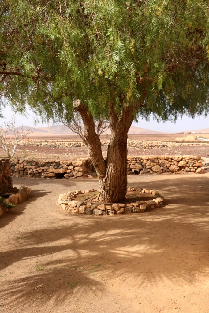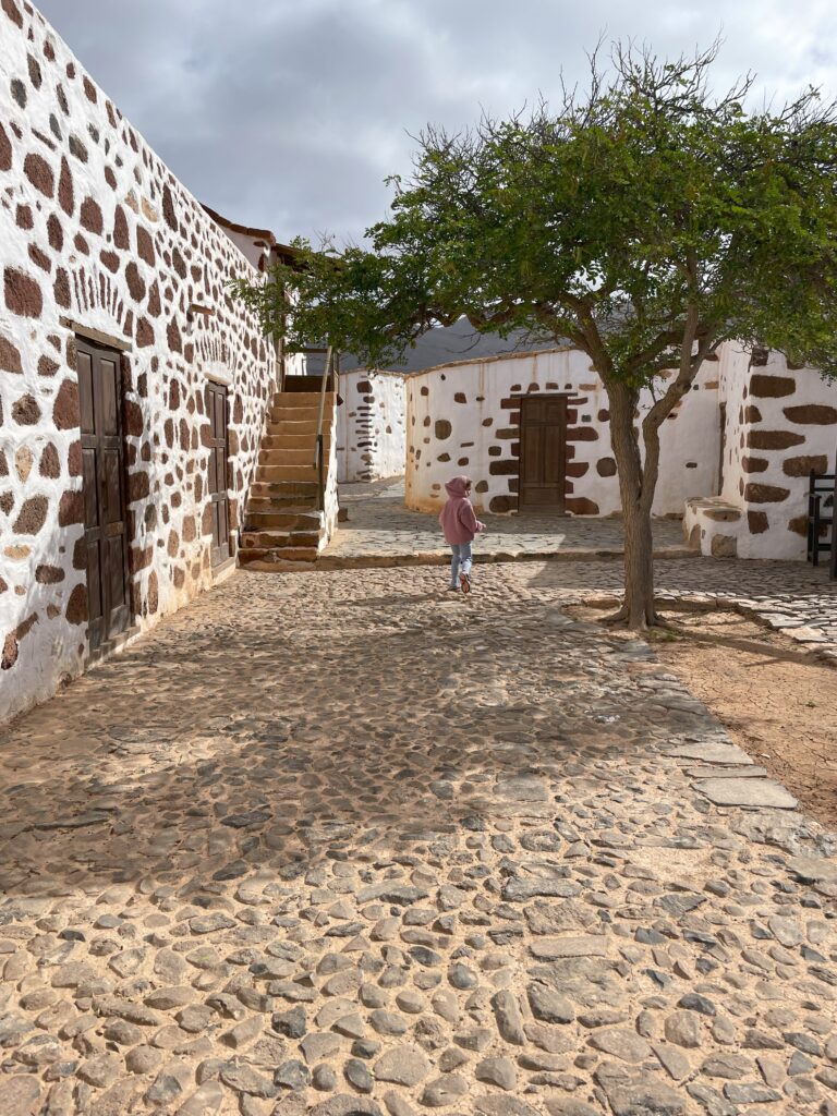 Kolejnego dnia by schronić się przed wiatrem postanowiliśmy schować się w zabudowaniach skansenu – historycznych zabudowań z Fuerteventury w Acolgida Ecomuseum w miejscowości Tefia. Skansen rozciąga się po dwóch stronach szosy i składa z 7 domostw do obejrzenia również od wewnątrz. W niektórych budynkach można spotkać rzemieślników tworzących wyroby z gliny, liści palmy lub koronki. Na terenie skansenu mieszkają także osiołki, owieczki i wielbłąd. Muzeum jest bardzo klimatyczne, wyraźnie oddaje ducha historii – warto tu zajrzeć chociażby w drodze do Betancurii.