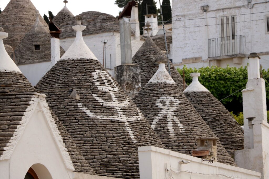 Pierwszego dnia po przylocie wybraliśmy się do prawdopodobnie jednej z najbardziej „folderowej” miejscowości Włoch, a na pewno tego regionu, czyli Arbellobello z charakterystyczną zabudową domków kamiennych tzw. trulli. Ze względu na swoją wyjątkowość miasteczko przyciąga masę tursytów, a główne uliczki są oblepione sklepikami z pamiątkami, co według mnie jest nieco odstraszające, ale na szczęście trafiliśmy na miejsca, w których były zarówno ciekawe widoki na całe miasteczko, jak i bardziej kameralne i niezatłoczone uliczki. W Arbellobello zjedliśmy charakterystyczną dla Apulli puccię – można to określić jako pizzowy placek z nadzieniem w środku.