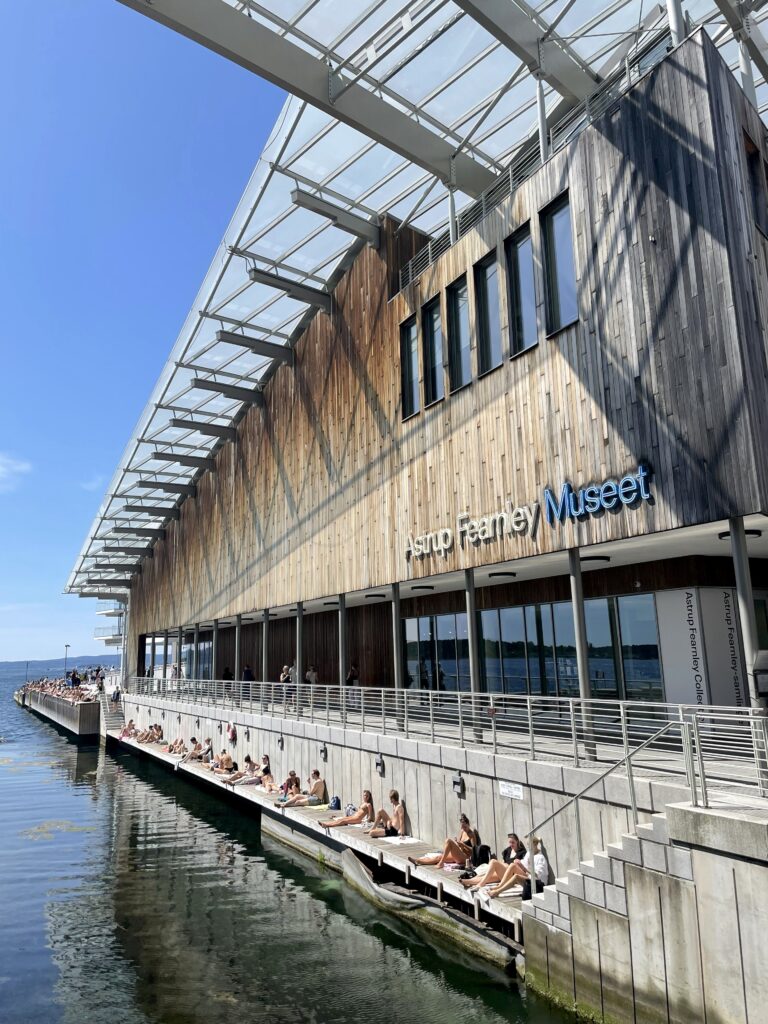 Dalej udałyśmy się do ultranowoczesnej dzielnicy Aker Brygge, gdzie nowoczesnej wieżowce mieszają się ze sztuką i wodą. Na końcu cypla, na którym mieści się dzielnica znajduje się muzeum sztuki nowoczesnej – Astrup Fearnley Museet. Ze względu na przepiękną pogodę tylko obejrzałyśmy budynek z zewnątrz. Natomiast mam przemyślenie, że gdyby mieć pecha z pogodą w Oslo to z pewnością można spędzić tu 3 dni tylko buszując po różnorodnych muzeach.