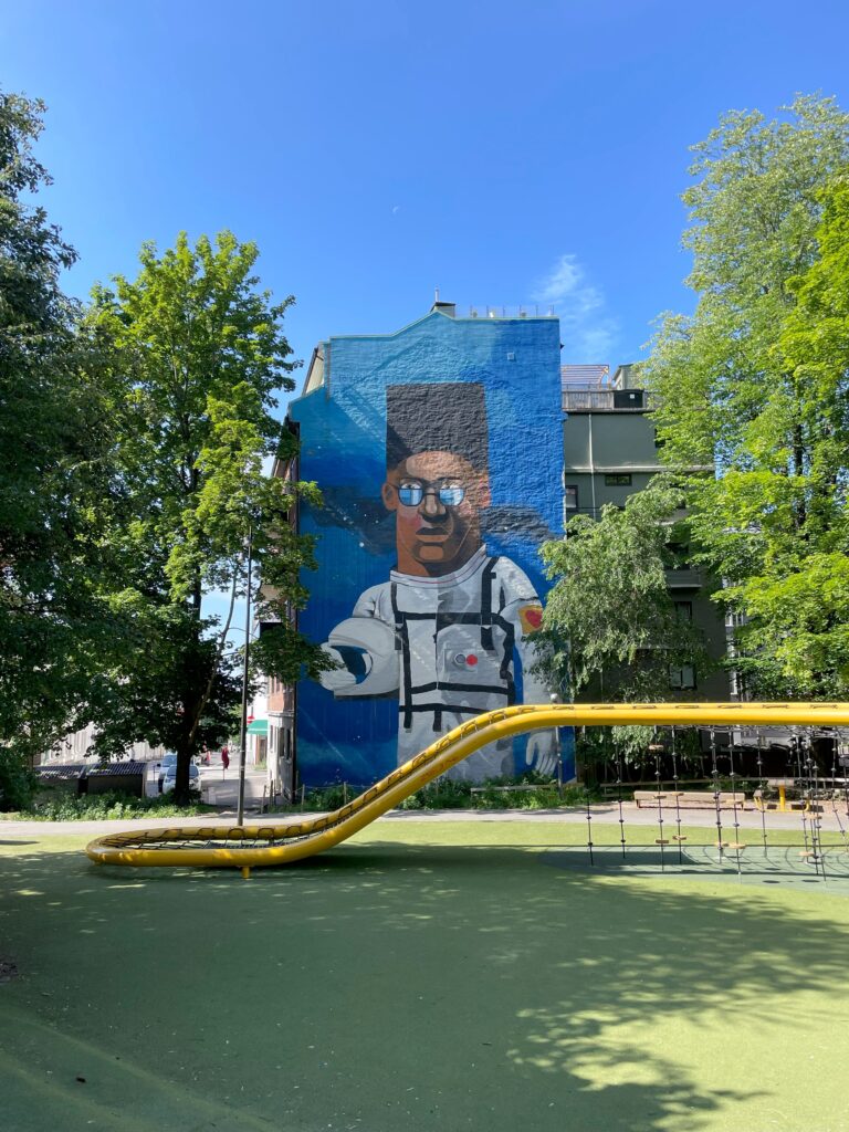 Dalej kierowałyśmy się w stronę historycznej dzielnicy Kampen z uroczą zabudową i ciekawymi muralami. Zjadłyśmy tutaj przepyszne kardamonki, które polecam spróbować podczas wizyty w Oslo. W samej dzielnicy najlepiej pokrążyć uliczkami i odkrywać różne detale tej charakterystycznej architektury.